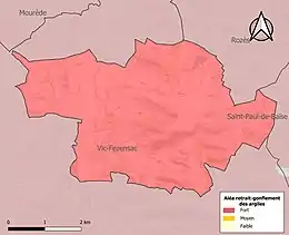 Le retrait-gonflement des sols argileux est susceptible d'engendrer des dommages importants aux bâtiments en cas d’alternance de périodes de sécheresse et de pluie. La totalité de la commune est en aléa moyen ou fort (94,5 % au niveau départemental et 48,5 % au niveau national). Sur les 202 bâtiments dénombrés sur la commune en 2019, 202 sont en aléa moyen ou fort, soit 100 %, à comparer aux 93 % au niveau départemental et 54 % au niveau national. Une cartographie de l'exposition du territoire national au retrait gonflement des sols argileux est disponible sur le site du BRGM[22],[Carte 3].