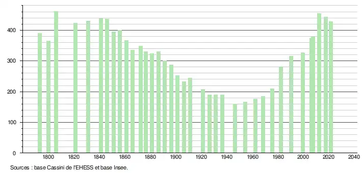 L'évolution du nombre d'habitants est connue à travers les recensements de la population effectués dans la commune depuis 1793. Pour les communes de moins de 10 000 habitants, une enquête de recensement portant sur toute la population est réalisée tous les cinq ans, les populations légales des années intermédiaires étant quant à elles estimées par interpolation ou extrapolation[25]. Pour la commune, le premier recensement exhaustif entrant dans le cadre du nouveau dispositif a été réalisé en 2007[26]. En 2021, la commune comptait 428 habitants[Note 3], en diminution de 6,55 % par rapport à 2015 (Gers : +0,79 %, France hors Mayotte : +1,84 %).