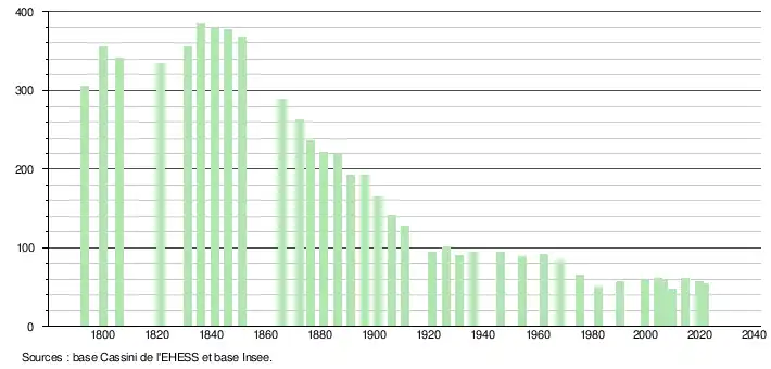 L'évolution du nombre d'habitants est connue à travers les recensements de la population effectués dans la commune depuis 1793. Pour les communes de moins de 10 000 habitants, une enquête de recensement portant sur toute la population est réalisée tous les cinq ans, les populations légales des années intermédiaires étant quant à elles estimées par interpolation ou extrapolation[16]. Pour la commune, le premier recensement exhaustif entrant dans le cadre du nouveau dispositif a été réalisé en 2004[17].