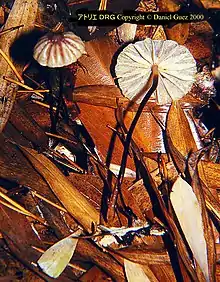 - Diagnose originale : Tsuguo HONGO*:Notes on Japanese larger fungi (13) 本郷次雄*:日本産きのこ類の研究(13) 78) Marasmius purpureostriatus Hongo sp. nov. Pileo 1-2.5 cm lato, campanulato-convexo, glabro, radiato-sulcato-striato,± rugoso-reticulato in parte centralis, eburneo, striis brunneolo-purpureis vel atro-purpureis, membranaceo, tenuissimo, coriaceo-carnoso, sicco; odore obsoleto; lamellis paucis, distantibus (L=13-18;1=0-1), in collarium liberum postice conjunctis, pallescenti-albis, ventricosis,± intervenosis, 2-4 mm latis; Stipite 3.5-1 1 cm longo, 1-2 mm crasso, basi leviter incrassato ye! radicato, rigido, fistuloso, fulvo, sursum pallido, inferne villoso-pruinoso, basi albido-strigoso-peronato. Sporis in cumulo albis, subaciculatis, laevibus, sub micr. hyalinis, nonamyloideis, 22.3-30 x 5-7µ ; basidiis tetrasporis, 37-41 x 10-1 1 p; pleurocystidiis nullis; acie lamellarum e cheilocystidiis heteromorpha (cheilocystidiis 12-26 x 7.5-14.5 µ,士crasse tunicatis, laevibus); epicute pilei ex strato hymeniformi elementis laevibus composito consistente. Hab. Gregarious or scattered on dead leaves and sticks in woods,Mii-dera、Otsu, May 30, 1953- Ishiyama-Hiratsu-chô, Otsu, May 7, 1957(type)near Kasuga-Shrine, Nara, April 24, 1958. Distr. Endemic (Shiga, Nara) A very distinct species, characterized by the purplish striations on the cap and the very long spores. Probably not uncommon. http://www.jjbotany.com/pdf/JJB_033_344_350.pdf