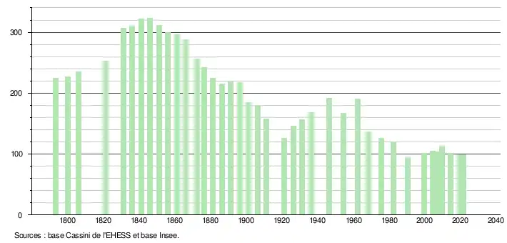 L'évolution du nombre d'habitants est connue à travers les recensements de la population effectués dans la commune depuis 1793. Pour les communes de moins de 10 000 habitants, une enquête de recensement portant sur toute la population est réalisée tous les cinq ans, les populations légales des années intermédiaires étant quant à elles estimées par interpolation ou extrapolation[15]. Pour la commune, le premier recensement exhaustif entrant dans le cadre du nouveau dispositif a été réalisé en 2004[16].