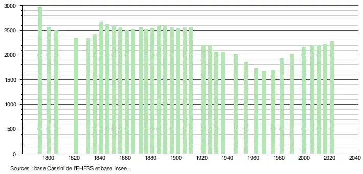 L'évolution du nombre d'habitants est connue à travers les recensements de la population effectués dans la commune depuis 1793. Pour les communes de moins de 10 000 habitants, une enquête de recensement portant sur toute la population est réalisée tous les cinq ans, les populations légales des années intermédiaires étant quant à elles estimées par interpolation ou extrapolation[22]. Pour la commune, le premier recensement exhaustif entrant dans le cadre du nouveau dispositif a été réalisé en 2006[23].