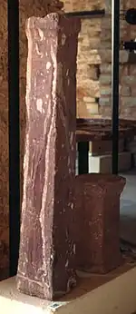 - Marbre de Iasos ou marbre de Carie ou marbre cipolin rouge[12], extrait près de la cité de Iasos sur la côte de la Carie en Turquie (actuellement commercialisé sous le nom de "marbre rouge lagune"). D’origine métamorphique et classable comme marbre impur à hématite, à grain fin et compacte, sur fond rouge foncé, qui est connu en trois variétés : celle plus connue présente de larges bandes blanches ou grisâtres. Plus rare, la variété « brèchée », avec fragments clastiques blanchâtres ou gris de dimensions variables, et la variété rouge uniforme, qui se distingue difficilement du marbre rouge antique. Il était utilisé localement à l’Époque hellénistique et son exportation vers Rome et autres endroits de la Méditerranée orientale s'est répandu à l’époque de la dynastie des Sévères jusqu’à l'époque de l’Empire byzantin, en particulier sous Justinien. Il a été utilisé en particulier pour les colonnes et les plaques de parement.