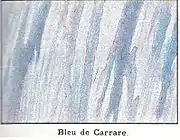 - Le bleu antique, Marbre à gros grain de couleur blanchâtre avec des ondes et des bandes d’un bleu ardoise, en zigzags interrompus. Il est rare et il jouit d’une légère lucidité lorsqu’il est en plaques minces.