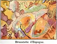 - Brocatelle de Tortosa ou Brocart espagnol, ("Marmor schiston"). C’est un calcaire organogène, caractérisé par un fond jaune doré avec des nuances rose-violacé et des taches (bioclastes) jaunes ou blanc-grisâtre ou roses de forme allongée qui lui donnent l’aspect du brocart, d’où il tire son nom de « brocart espagnol », localement appelé « jaspi della Cinta » qui dérive de l’emploi de cette pierre qui orne la chapelle de la « Madonna della Cintura » de la cathédrale de Tortosa, antique ville romaine près de l’Ebre.