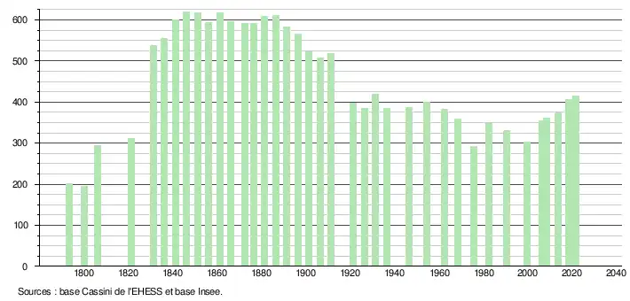 L'évolution du nombre d'habitants est connue à travers les recensements de la population effectués dans la commune depuis 1793. Pour les communes de moins de 10 000 habitants, une enquête de recensement portant sur toute la population est réalisée tous les cinq ans, les populations légales des années intermédiaires étant quant à elles estimées par interpolation ou extrapolation[22]. Pour la commune, le premier recensement exhaustif entrant dans le cadre du nouveau dispositif a été réalisé en 2008[23].