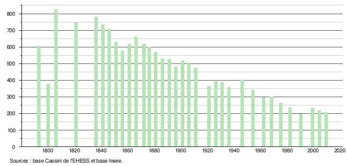 - Dans le tableau des recensements et le graphique, par convention dans Wikipédia, le principe a été retenu, pour les populations légales postérieures à 1999 de n’afficher dans le tableau des recensements et le graphique que les populations correspondant à l'année 2006, première population légale publiée calculée conformément aux concepts définis dans le décret no 2003-485 du 5 juin 2003, et les années correspondant à une enquête exhaustive de recensement pour les communes de moins de 10 000 habitants, ainsi que la dernière population légale publiée par l’Insee.