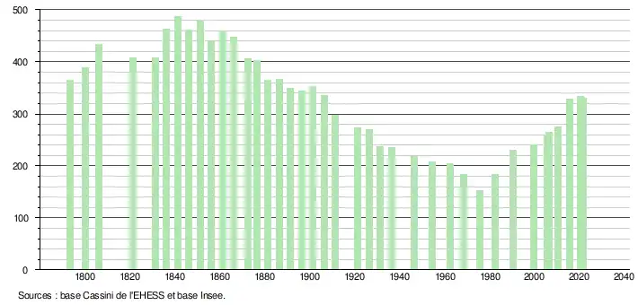 L'évolution du nombre d'habitants est connue à travers les recensements de la population effectués dans la commune depuis 1793. Pour les communes de moins de 10 000 habitants, une enquête de recensement portant sur toute la population est réalisée tous les cinq ans, les populations légales des années intermédiaires étant quant à elles estimées par interpolation ou extrapolation[10]. Pour la commune, le premier recensement exhaustif entrant dans le cadre du nouveau dispositif a été réalisé en 2005[11].