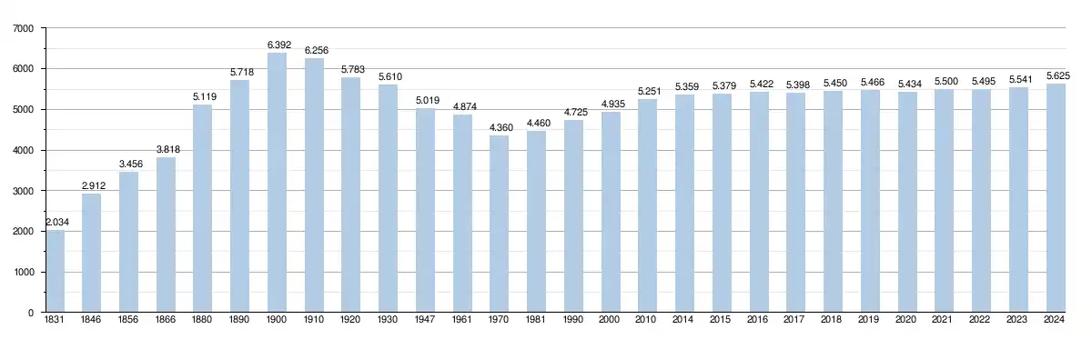 Elle comptait, au , 5 639 habitants (2 793 hommes et 2 846 femmes) [15], soit une densité de 186,97 habitants/km² pour une superficie de 30,16 km²[16].
