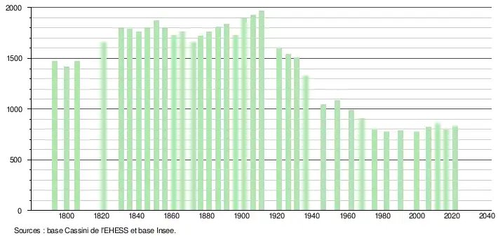 En 2021, la commune comptait 830 habitants[Note 4], en augmentation de 1,72 % par rapport à 2015 (Corrèze : −0,86 %, France hors Mayotte : +1,84 %).