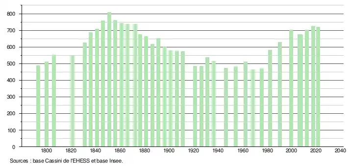 L'évolution du nombre d'habitants est connue à travers les recensements de la population effectués dans la commune depuis 1793. Pour les communes de moins de 10 000 habitants, une enquête de recensement portant sur toute la population est réalisée tous les cinq ans, les populations légales des années intermédiaires étant quant à elles estimées par interpolation ou extrapolation[23]. Pour la commune, le premier recensement exhaustif entrant dans le cadre du nouveau dispositif a été réalisé en 2007[24].