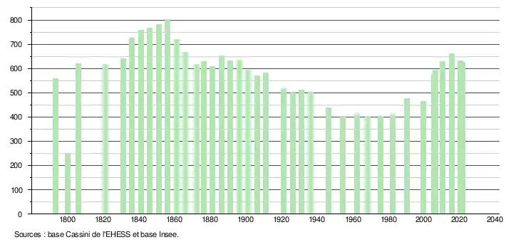 L'évolution du nombre d'habitants est connue à travers les recensements de la population effectués dans la commune depuis 1793. Pour les communes de moins de 10 000 habitants, une enquête de recensement portant sur toute la population est réalisée tous les cinq ans, les populations légales des années intermédiaires étant quant à elles estimées par interpolation ou extrapolation[17]. Pour la commune, le premier recensement exhaustif entrant dans le cadre du nouveau dispositif a été réalisé en 2005[18].