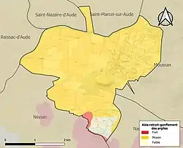 Le retrait-gonflement des sols argileux est susceptible d'engendrer des dommages importants aux bâtiments en cas d’alternance de périodes de sécheresse et de pluie. 95,6 % de la superficie communale est en aléa moyen ou fort (75,2 % au niveau départemental et 48,5 % au niveau national). Sur les 593 bâtiments dénombrés sur la commune en 2019, 593 sont en aléa moyen ou fort, soit 100 %, à comparer aux 94 % au niveau départemental et 54 % au niveau national. Une cartographie de l'exposition du territoire national au retrait gonflement des sols argileux est disponible sur le site du BRGM[31],[Carte 3].