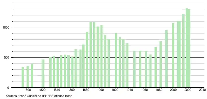| L'évolution du nombre d'habitants est connue à travers les recensements de la population effectués dans la commune depuis 1793. Pour les communes de moins de 10 000 habitants, une enquête de recensement portant sur toute la population est réalisée tous les cinq ans, les populations légales des années intermédiaires étant quant à elles estimées par interpolation ou extrapolation[33]. Pour la commune, le premier recensement exhaustif entrant dans le cadre du nouveau dispositif a été réalisé en 2008[34]. En 2021, la commune comptait 1 303 habitants[Note 6], en augmentation de 2,84 % par rapport à 2015 (Aude : +2,47 %, France hors Mayotte : +1,84 %). |