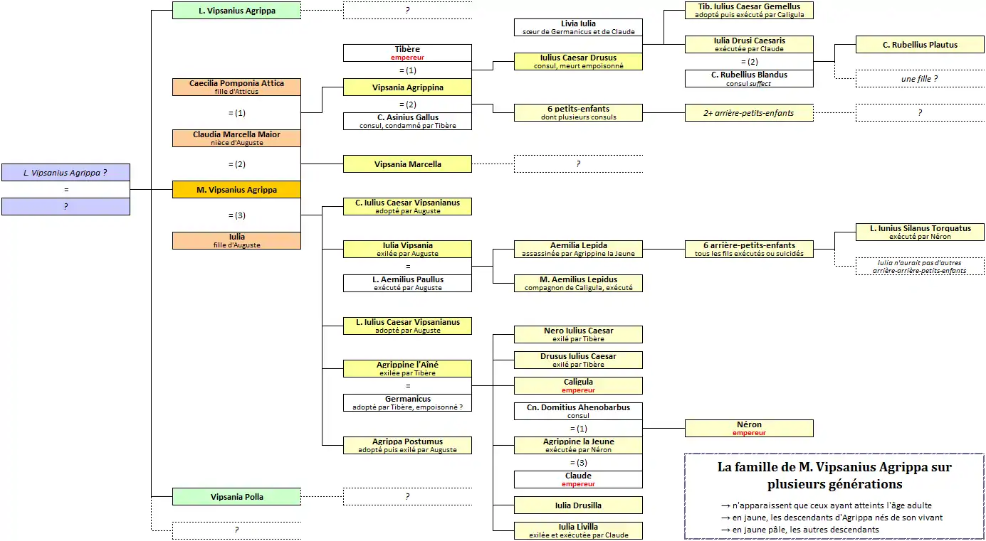 Partie prenante des stratégies matrimoniales d'Auguste afin d'assurer une continuité dynastique à son nouveau régime, il épouse en troisièmes noces la fille unique d'Auguste, Julia, en l'an , avec qui il eut 5 enfants, dont Caius et Lucius César, adoptés par Auguste et faits Princes de la Jeunesse et héritiers de l'Empire avant leur décès prématuré. Devenu gendre de l'empereur Auguste, dont il avait auparavant épousé la nièce Claudia Marcella l'Aînée, il est le premier beau-père du futur empereur Tibère à qui il donne en mariage sa fille Vipsania Agrippina puis son autre fille Agrippine l'Aînée, et enfin par sa petite-fille Agrippine la Jeune. Il est ainsi à la fois le grand-père maternel de l'empereur Caligula, l'arrière-grand-père maternel de l'empereur Néron, ainsi que le beau-père du général Germanicus, héritier présomptif de l'Empire jusqu'à sa mort et frère aîné de l’empereur Claude, qui épousa par ailleurs en dernières noces Agrippine la Jeune, petite-fille d'Agrippa.