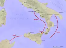 En 36 av. J.-C., Octavien et Agrippa lancent l’offensive navale depuis l'Italie contre Sextus Pompée, tandis que Lépide, depuis l’Afrique, débarque avec de nombreuses troupes à l’extrême-ouest de l’île[c 28],[j 17]. La flotte d'Agrippa est sévèrement endommagée par les tempêtes et doit se retirer. Octavien est découragé, mais Agrippa le convainc de ne pas renoncer[h 10]. Agrippa tente seul une deuxième offensive. Agrippa parvient finalement à s'installer aux îles Lipari, cherche à attirer la flotte pompéienne puis décide de prendre l'initiative[h 10]. Grâce à son entraînement et à sa technologie supérieure, la flotte d'Agrippa remporte une victoire décisive à Mylae, dans le nord-est de la Sicile, le 2 août[j 18],[c 29].
