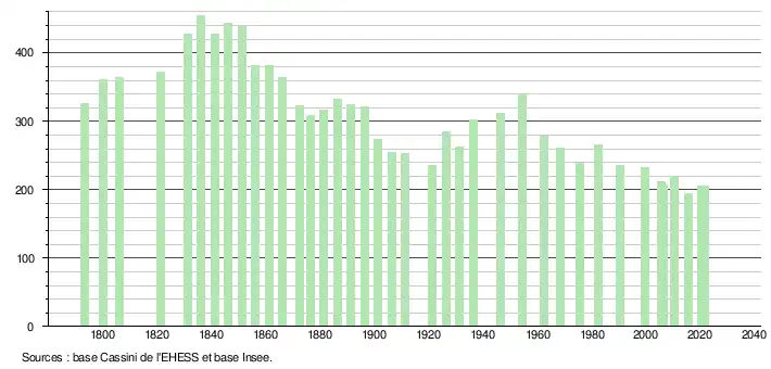 L'évolution du nombre d'habitants est connue à travers les recensements de la population effectués dans la commune depuis 1793. Pour les communes de moins de 10 000 habitants, une enquête de recensement portant sur toute la population est réalisée tous les cinq ans, les populations légales des années intermédiaires étant quant à elles estimées par interpolation ou extrapolation[19]. Pour la commune, le premier recensement exhaustif entrant dans le cadre du nouveau dispositif a été réalisé en 2005[20].