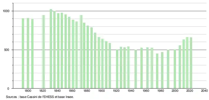 L'évolution du nombre d'habitants est connue à travers les recensements de la population effectués dans la commune depuis 1793. Pour les communes de moins de 10 000 habitants, une enquête de recensement portant sur toute la population est réalisée tous les cinq ans, les populations légales des années intermédiaires étant quant à elles estimées par interpolation ou extrapolation[22]. Pour la commune, le premier recensement exhaustif entrant dans le cadre du nouveau dispositif a été réalisé en 2006[23].
