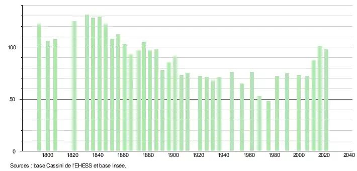 L'évolution du nombre d'habitants est connue à travers les recensements de la population effectués dans la commune depuis 1793. Pour les communes de moins de 10 000 habitants, une enquête de recensement portant sur toute la population est réalisée tous les cinq ans, les populations légales des années intermédiaires étant quant à elles estimées par interpolation ou extrapolation[28]. Pour la commune, le premier recensement exhaustif entrant dans le cadre du nouveau dispositif a été réalisé en 2006[29].
