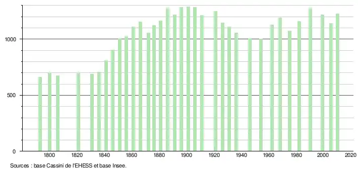 L'évolution du nombre d'habitants est connue à travers les recensements de la population effectués dans la commune depuis 1793. À partir du , les populations légales des communes sont publiées annuellement dans le cadre d'un recensement qui repose désormais sur une collecte d'information annuelle, concernant successivement tous les territoires communaux au cours d'une période de cinq ans. Pour les communes de moins de 10 000 habitants, une enquête de recensement portant sur toute la population est réalisée tous les cinq ans, les populations légales des années intermédiaires étant quant à elles estimées par interpolation ou extrapolation[12]. Pour la commune, le premier recensement exhaustif entrant dans le cadre du nouveau dispositif a été réalisé en 2005[13],[Note 1].
