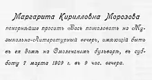 Elle invite aussi chez elle la Conférence panrusse des zemstvos, après avoir obtenu le soutien du général Kozlov, gouverneur-général de Moscou, et ancien ami de sa mère. Il donne son autorisation malgré une précédente conversation téléphonique avec le général Trepov, du ministère de l'Intérieur, qui s'y oppose. Trois cents délégués, sous la présidence du comte van Heiden (1840-1907), participent à cette conférence qui se tient dans l'hôtel particulier de Margarita Morozova. Le prince Sergueï Troubetskoï[25] propose de rédiger une supplique à l'empereur Nicolas II, proposition critiquée à gauche par Pavel Milioukov et à droite par Dmitri Chipov (1851-1920). Les débats se déroulent du 24 au , moins de six mois avant le Manifeste du 17 octobre qui donne naissance au mouvement des octobristes (dont Chipov fera partie) et au parti KD (dont Milioukov fera partie).