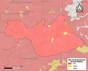 Le retrait-gonflement des sols argileux est susceptible d'engendrer des dommages importants aux bâtiments en cas d’alternance de périodes de sécheresse et de pluie. La totalité de la commune est en aléa moyen ou fort (67,4 % au niveau départemental et 48,5 % au niveau national). Sur les 213 bâtiments dénombrés sur la commune en 2019, 213 sont en aléa moyen ou fort, soit 100 %, à comparer aux 84 % au niveau départemental et 54 % au niveau national. Une cartographie de l'exposition du territoire national au retrait gonflement des sols argileux est disponible sur le site du BRGM[20],[Carte 2].