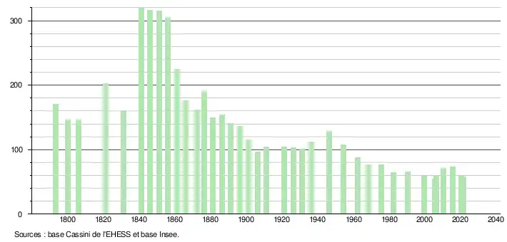 L'évolution du nombre d'habitants est connue à travers les recensements de la population effectués dans la commune depuis 1793. Pour les communes de moins de 10 000 habitants, une enquête de recensement portant sur toute la population est réalisée tous les cinq ans, les populations légales des années intermédiaires étant quant à elles estimées par interpolation ou extrapolation[27]. Pour la commune, le premier recensement exhaustif entrant dans le cadre du nouveau dispositif a été réalisé en 2005[28].