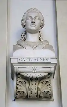 - On peut voir à la pinacothèque de Brera un buste d'Agnesi[70]. L'artiste, Giuseppe Franchi, pour son premier buste de 1781, utilisait de faux motifs pour la voir. Il fit plusieurs copies de ce buste. Pour la copie faite plus tard pour le cardinal Antonio Dugnani et dûment retouchée pour l'âge, Agnesi accepta de poser[71],[72],[73].
