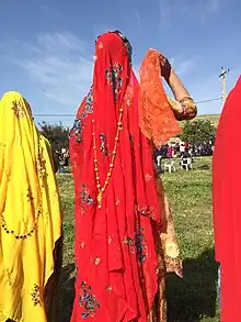 - Le voile meynā (persan : مَینا) est fixé sur le lachak et est fait d'une étoffe légère plus ou moins transparente et de couleur vive.