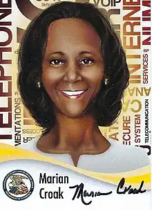 Marian Rogers Croak est vice-présidente de l'ingénierie chez Google. Elle est auparavant vice-présidente principale de la recherche et du développement chez AT&T[1]. Elle détient plus de 200 brevets[2]. Elle a est intronisée au Women in Technology International Hall of Fame en 2013[2]. En 2022, Marian Croak est intronisée au National Inventors Hall of Fame pour son brevet concernant la technologie VoIP (Voice over Internet Protocol)[3]. Elle est l'une des deux premières femmes noires à recevoir cet honneur, avec Patricia Bath[4]. Son invention permet aux utilisateurs de passer des appels via Internet au lieu d'une ligne téléphonique. Aujourd'hui, l'utilisation généralisée de la technologie VoIP est vitale pour le travail à distance et les conférences[3].