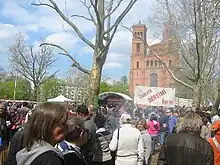 La foule durant Myfest 2013 sur la Mariannenplatz avec l'église Saint-Thomas en arrière-plan.