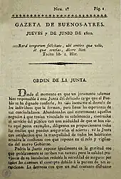 Après que la Junte de Séville eut été défaite, une autre, le Conseil de Régence, fut créée aussitôt. Si la Première Junte (argentine) se refusa à faire serment de loyauté envers le Conseil de Régence, la Real Audiencia en revanche fit allégeance à celui-ci, défiant ainsi la nouvelle autorité locale. Mis en demeure par la Junte, les membres de l’Audiencia, ainsi que le ci-devant vice-roi Cisneros, furent exilés vers l’Espagne, au motif que leurs vies étaient menacées. La Junte nomma une nouvelle Audiencia, composée de membres loyaux à la révolution[37]. Moreno écrivit dans la Gazeta que l’Audiencia attaquait la bonne foi du gouvernement, et que la Junte, par souci de la sécurité du peuple, fut contrainte de réserver temporairement son habituelle modération[38].