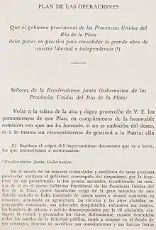 Donnant suite à une proposition de Manuel Belgrano, la Junte résolut de rédiger une plateforme politique dans laquelle serait défini un ensemble de grands objectifs ainsi que les procédures à suivre pour les réaliser. La rédaction de ce document, désigné souvent par le raccourci Plan d’opérations (en esp. Plan de Operaciones ou de las Operaciones), fut confiée à Mariano Moreno. L’authenticité de ce document a été contestée par certains historiens, notamment Paul Groussac, qui le soupçonnait d’être un faux, fabriqué par un Espagnol travaillant à la cour du Portugal dans le but de discréditer la Junte[66] ; d’autres historiens cependant, comme Norberto Piñero, soulignent, pour défendre l’authenticité de ce document, que son contenu en tous cas n’est pas en porte-à-faux avec les actes décidés par le gouvernement de la Première Junte[67],[68].