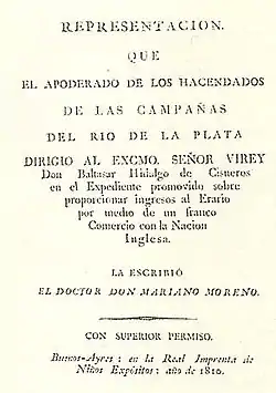 Un important groupe de grands fermiers, qui ne s’estimaient pas adéquatement représentés dans le Cabildo, sollicitèrent Moreno de rédiger une apologie de l’ouverture économique. Répondant à ce vœu, il fit paraître une étude économique intitulée La Representación de los Hacendados, dans laquelle il prônait le libre-échange, attaquait les privilèges des monopolistes, et défendait les intérêts des éleveurs exportateurs. Ce mémoire est considéré comme le rapport économique le plus complet sur le Río de la Plata à l’époque de la vice-royauté[17] ; il y exposait les idées économiques nouvelles élaborées en Europe, et faisait observer que le monopole commercial avec l’Espagne n’empêchait nullement les produits anglais d’être introduits illégalement dans le pays.