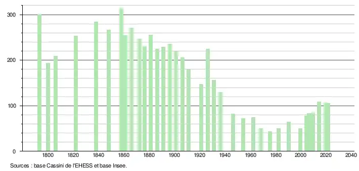 L'évolution du nombre d'habitants est connue à travers les recensements de la population effectués dans la commune depuis 1793. Pour les communes de moins de 10 000 habitants, une enquête de recensement portant sur toute la population est réalisée tous les cinq ans, les populations légales des années intermédiaires étant quant à elles estimées par interpolation ou extrapolation[25]. Pour la commune, le premier recensement exhaustif entrant dans le cadre du nouveau dispositif a été réalisé en 2004[26].