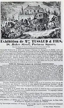 En 1835, Marie Tussaud, âgée alors de 74 ans et fatiguée de sa vie itinérante, installe sa première exposition permanente dans une salle louée dans Baker Street, nommée Baker Street Bazaar, musée de cire qui deviendra le Madame Tussauds. L'une des principales attractions est la Chambre des horreurs, qui présente en deux parties les victimes de la Révolution française et les meurtriers. En 1838, elle réalise le portrait de la reine Victoria, à l'occasion de son couronnement, ce qui fait du musée le lieu à la mode[7].