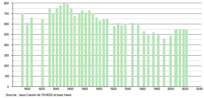 L'évolution du nombre d'habitants est connue à travers les recensements de la population effectués dans la commune depuis 1793. Pour les communes de moins de 10 000 habitants, une enquête de recensement portant sur toute la population est réalisée tous les cinq ans, les populations légales des années intermédiaires étant quant à elles estimées par interpolation ou extrapolation[20]. Pour la commune, le premier recensement exhaustif entrant dans le cadre du nouveau dispositif a été réalisé en 2007[21].