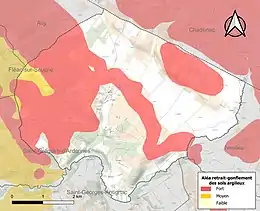 Le retrait-gonflement des sols argileux est susceptible d'engendrer des dommages importants aux bâtiments en cas d’alternance de périodes de sécheresse et de pluie. 45,1 % de la superficie communale est en aléa moyen ou fort (54,2 % au niveau départemental et 48,5 % au niveau national). Sur les 223 bâtiments dénombrés sur la commune en 2019, 86 sont en aléa moyen ou fort, soit 39 %, à comparer aux 57 % au niveau départemental et 54 % au niveau national. Une cartographie de l'exposition du territoire national au retrait gonflement des sols argileux est disponible sur le site du BRGM[14],[Carte 2].