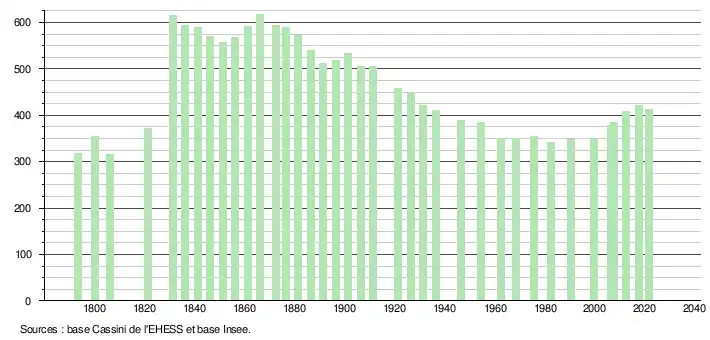 L'évolution du nombre d'habitants est connue à travers les recensements de la population effectués dans la commune depuis 1793. Pour les communes de moins de 10 000 habitants, une enquête de recensement portant sur toute la population est réalisée tous les cinq ans, les populations légales des années intermédiaires étant quant à elles estimées par interpolation ou extrapolation[16]. Pour la commune, le premier recensement exhaustif entrant dans le cadre du nouveau dispositif a été réalisé en 2007[17].
