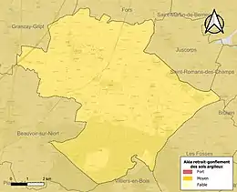 Les mouvements de terrains susceptibles de se produire sur la commune sont des tassements différentiels[17]. Le retrait-gonflement des sols argileux est susceptible d'engendrer des dommages importants aux bâtiments en cas d’alternance de périodes de sécheresse et de pluie[18]. La totalité de la commune est en aléa moyen ou fort (54,9 % au niveau départemental et 48,5 % au niveau national)[Carte 2]. Depuis le , en application de la loi ELAN, différentes contraintes s'imposent aux vendeurs, maîtres d'ouvrages ou constructeurs de biens situés dans une zone classée en aléa moyen ou fort[Note 3],[19].