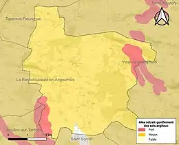Le retrait-gonflement des sols argileux est susceptible d'engendrer des dommages importants aux bâtiments en cas d’alternance de périodes de sécheresse et de pluie. 99,4 % de la superficie communale est en aléa moyen ou fort (67,4 % au niveau départemental et 48,5 % au niveau national). Sur les 381 bâtiments dénombrés sur la commune en 2019, 376 sont en aléa moyen ou fort, soit 99 %, à comparer aux 81 % au niveau départemental et 54 % au niveau national. Une cartographie de l'exposition du territoire national au retrait gonflement des sols argileux est disponible sur le site du BRGM[21],[Carte 3].