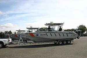 4 | Ces Nor-Tech ont été construits sans les couchettes et les réservoirs d'eau pour s'adapter à l'emport de 100 gallons de carburant supplémentaires et d'autres équipements, comme une caméra à infrarouges et du matériel de communication. Ils sont utilisés pour la patrouille côtière et fluviale, de recherche et de sauvetage, des opérations anti-narcotiques à cause de leur vitesse. Ces patrouilleurs ne sont pas armés, mais ils embarquent des fusils M-16. | ![]() LR-155 Castor | |||||||