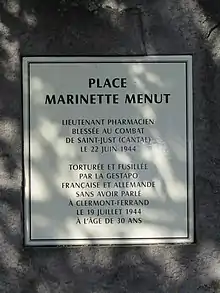 - Deux places portent son nom : l'une d'elles étant la place Marinette Menut à Riom où se trouve une stèle commémorative (ainsi qu'un arrêt de bus), et l'autre à Clermont-Ferrand.
