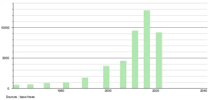 - Par convention dans Wikipédia, le principe a été retenu de n’afficher dans le tableau des recensements et le graphique, pour les populations légales postérieures à 1999, que les populations correspondant à une enquête exhaustive de recensement pour les communes de moins de 10 000 habitants, et que les populations des années 2006, 2011, 2016, etc. pour les communes de plus de 10 000 habitants, ainsi que la dernière population légale publiée par l’Insee pour l'ensemble des communes.
