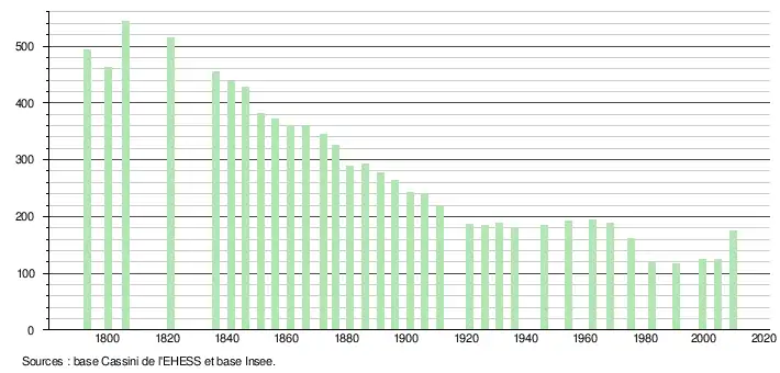 - Par convention dans Wikipédia, le principe a été retenu de n’afficher dans le tableau des recensements et le graphique, pour les populations légales postérieures à 1999, que les populations correspondant à une enquête exhaustive de recensement pour les communes de moins de 10 000 habitants, et que les populations des années 2006, 2011, 2016, etc. pour les communes de plus de 10 000 habitants, ainsi que la dernière population légale publiée par l’Insee pour l'ensemble des communes.