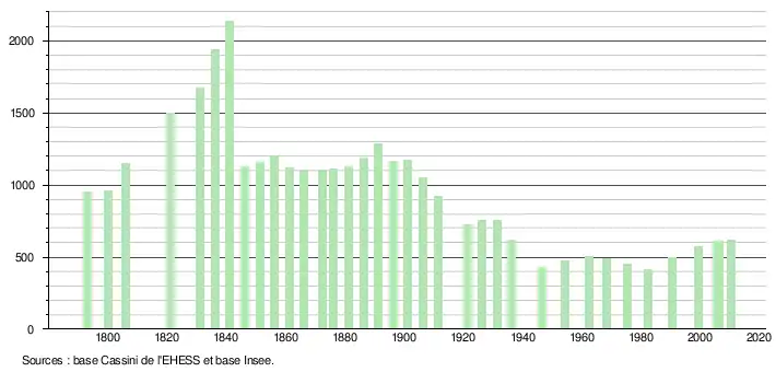 L'évolution du nombre d'habitants est connue à travers les recensements de la population effectués dans la commune depuis 1793. À partir du , les populations légales des communes sont publiées annuellement dans le cadre d'un recensement qui repose désormais sur une collecte d'information annuelle, concernant successivement tous les territoires communaux au cours d'une période de cinq ans. Pour les communes de moins de 10 000 habitants, une enquête de recensement portant sur toute la population est réalisée tous les cinq ans, les populations légales des années intermédiaires étant quant à elles estimées par interpolation ou extrapolation[2]. Pour la commune, le premier recensement exhaustif entrant dans le cadre du nouveau dispositif a été réalisé en [3],[Note 1].