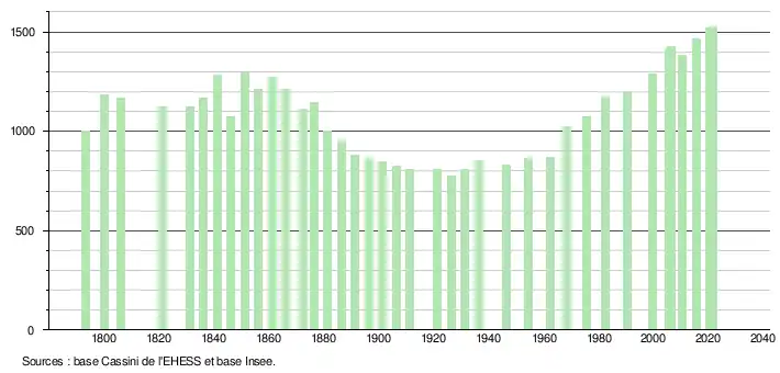 L'évolution du nombre d'habitants est connue à travers les recensements de la population effectués dans la commune depuis 1793. Pour les communes de moins de 10 000 habitants, une enquête de recensement portant sur toute la population est réalisée tous les cinq ans, les populations légales des années intermédiaires étant quant à elles estimées par interpolation ou extrapolation[23]. Pour la commune, le premier recensement exhaustif entrant dans le cadre du nouveau dispositif a été réalisé en 2005[24].