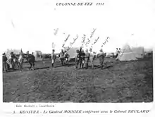 En 1911, des circonstances favorables permettent tout d'abord une intervention militaire. En , le sultan Moulay Hafid, qui avait détrôné son frère, le sultan Moulay Abd-al-Aziz, est assiégé à Fès par les tribus amazighs (berbères) rebelles. Il fait alors appel à la France, dont une colonne, commandée par le général Moinier, commandant en chef de la colonne de Fès, composée de 20 000 hommes, dégage sa capitale[2]. Cette intervention militaire provoque une vive réaction de l'Allemagne, qui, pour défendre ses intérêts, envoie le 1er juillet une canonnière devant Agadir. Ce Coup d'Agadir se termine par un accord entre la France et l'Allemagne, accord qui laisse les mains libres à la France au Maroc: le protectorat peut s'installer.