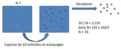 Supposons une population de taille N, que l'on veut estimer, et M le nombre d'individus capturés, marqués de façon reconnaissable puis relâchés : c'est la première séance de capture. À noter que tous les individus ne sont pas forcément capturés, facteur dépendant de la détectabilité. Une seconde capture est faite après un temps t, assez court, afin d'éviter la mortalité ou les mouvements d'individus (immigration et émigration) mais assez long pour que les individus se mélangent de manière homogène avec le reste de la population. Cette capture de n individus contient un nombre m d'individus déjà marqués lors de la première séance de capture[1].