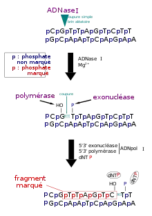 - l'endonucléase DNase I qui provoque des coupures simple brin au hasard sur l'ADN;